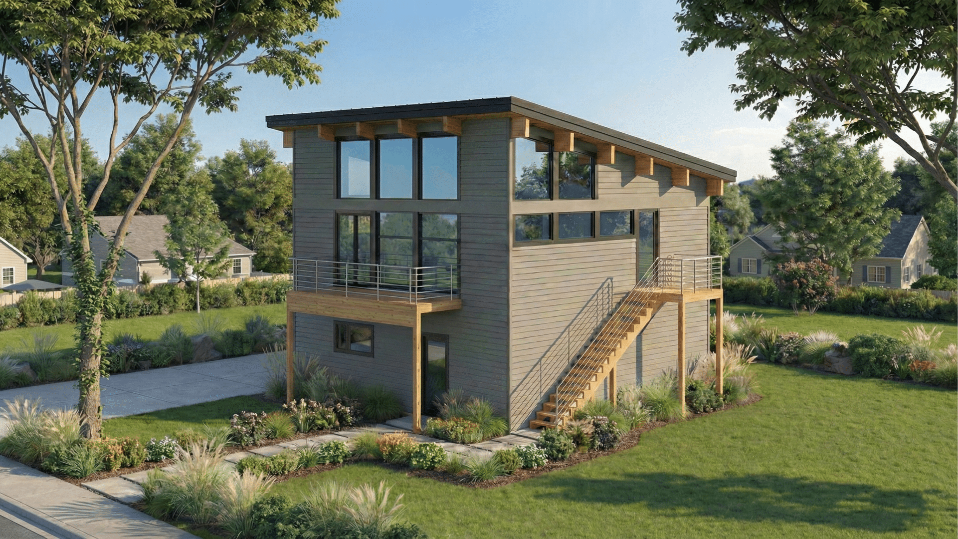 A small Lindal Elements home, the Birch is designed to elevate your lifestyle while maintaining a small footprint. By elevating the living spaces above a functional garage and storage level, this home captures panoramic views through floor-to-ceiling windows. The interior features a streamlined layout that connects the kitchen, living room, and primary suite along a central axis, highlighted by modern beam work that accentuates the Lindal post and beam system.