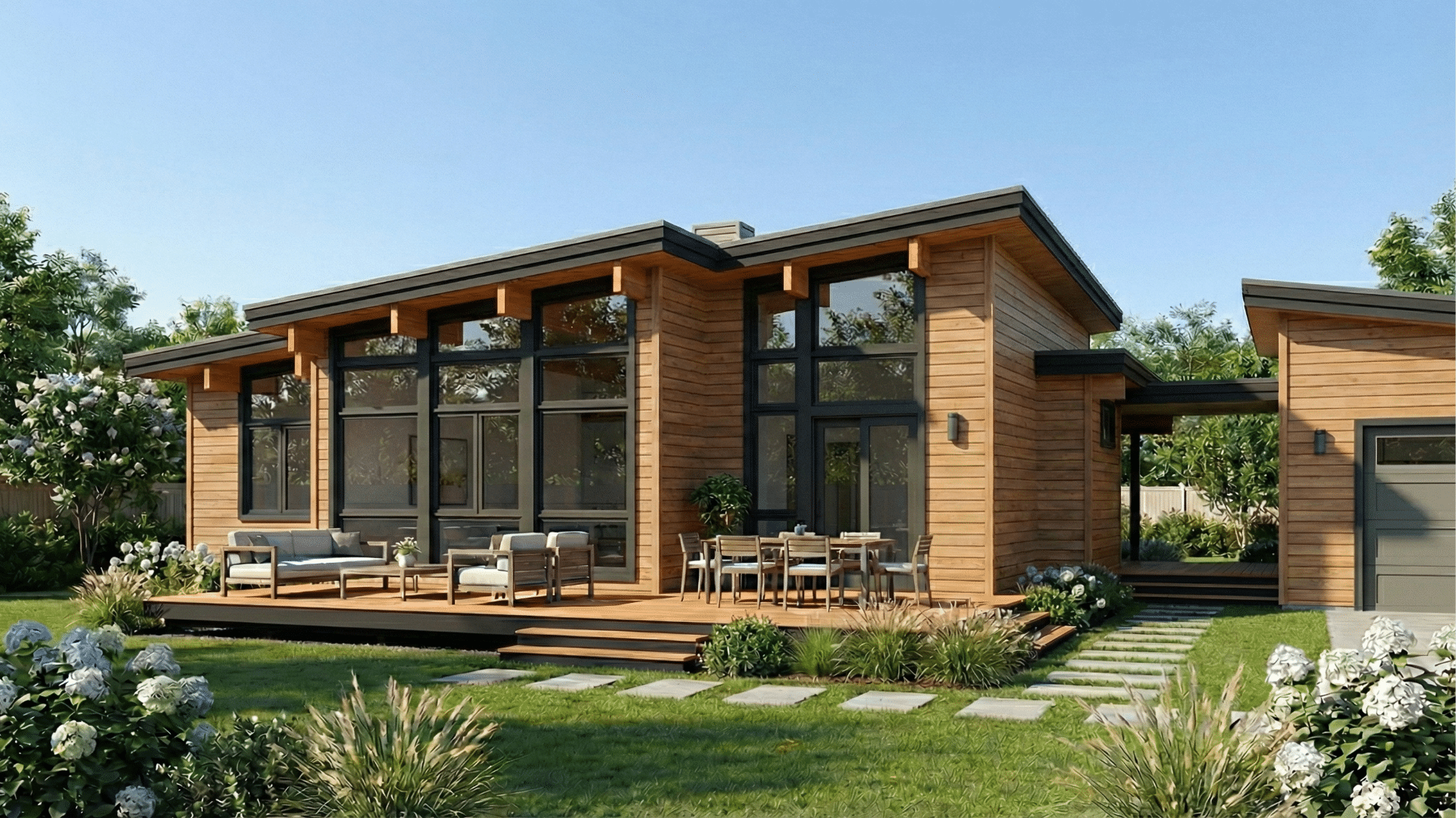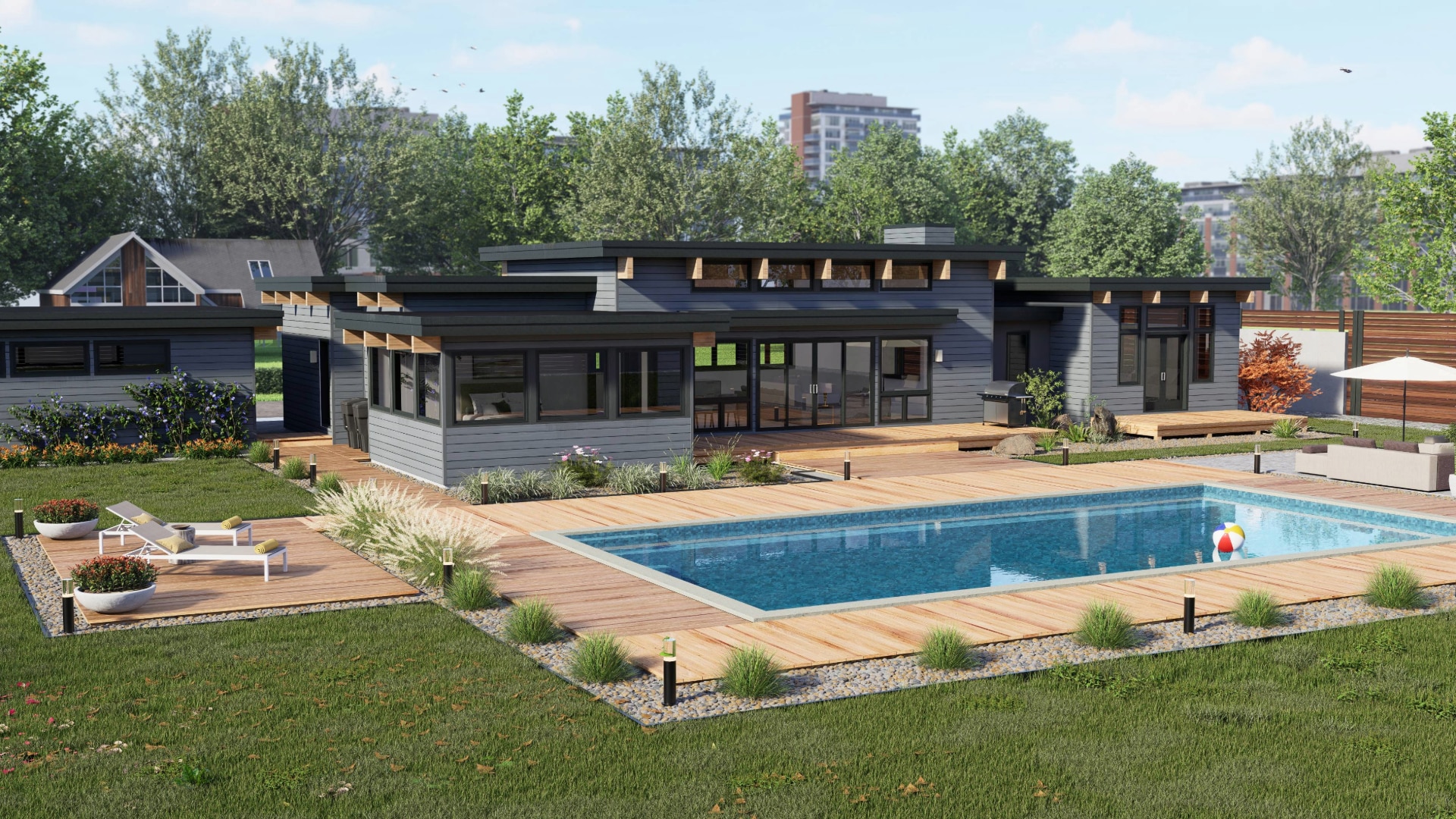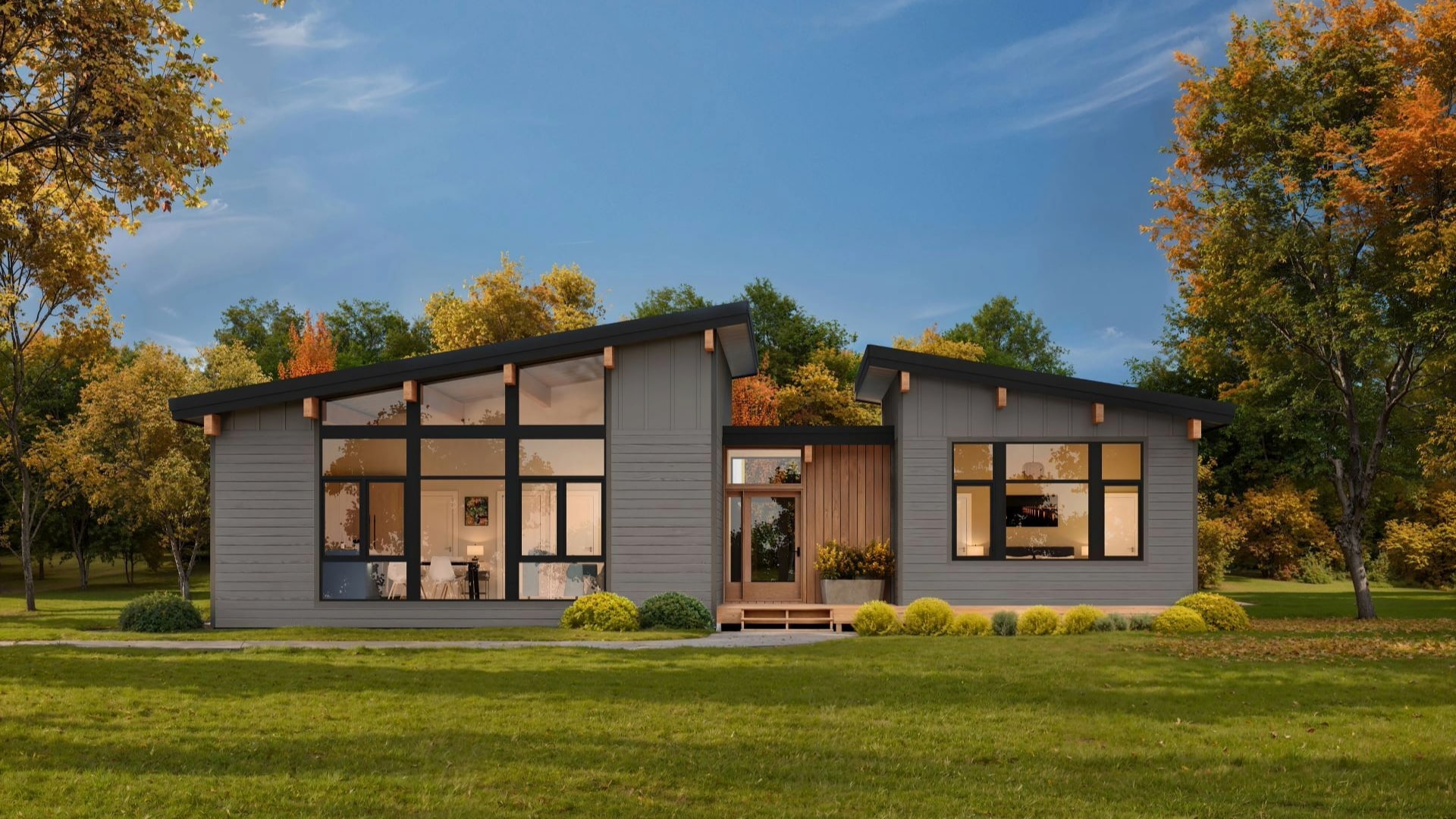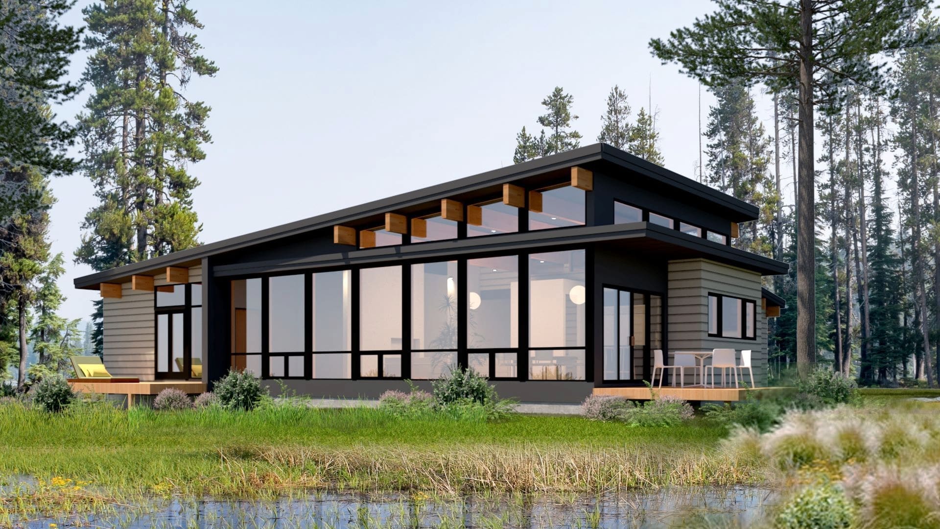 Simple, striking, and light-filled, the Elm is a quintessential Lindal Elements design. Its bold mono-pitch roof allows for dramatic clerestory windows that capture light from every angle. The intuitive floor plan centers on a voluminous great room and kitchen, flanked by private suites that offer quiet separation. Whether used as a primary residence or a mountain getaway, the Elm’s clean lines create a seamless connection to the natural environment.
