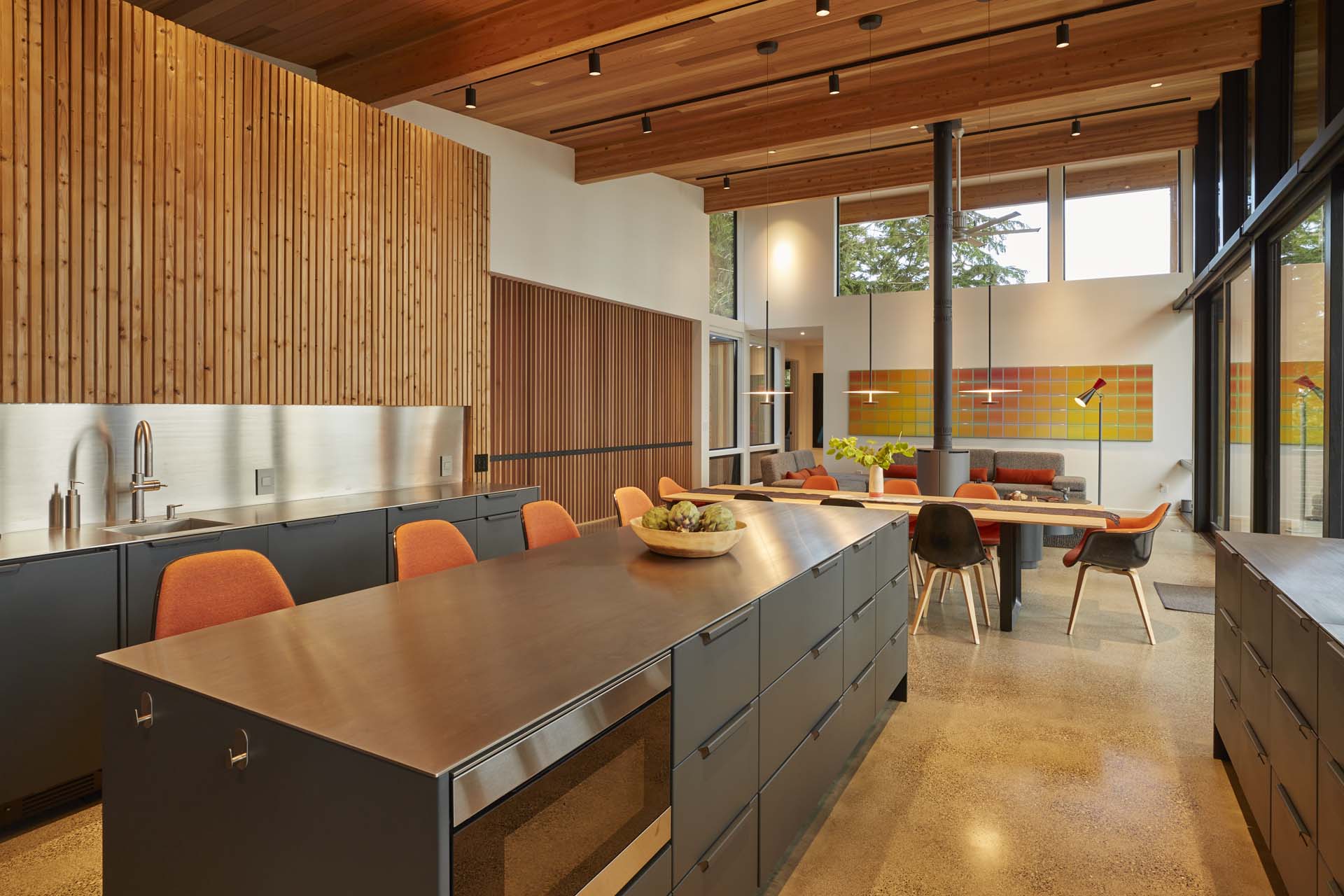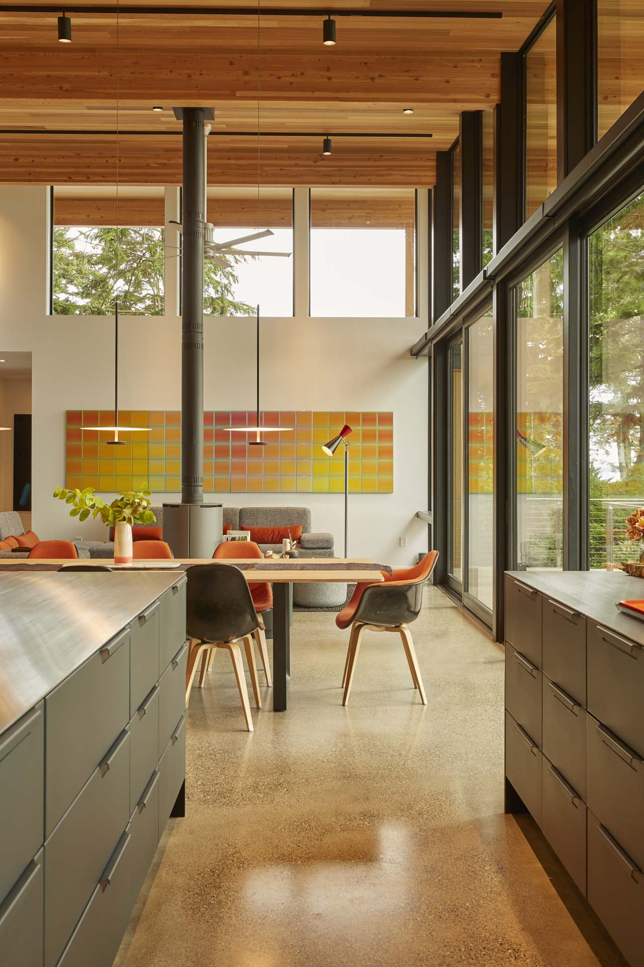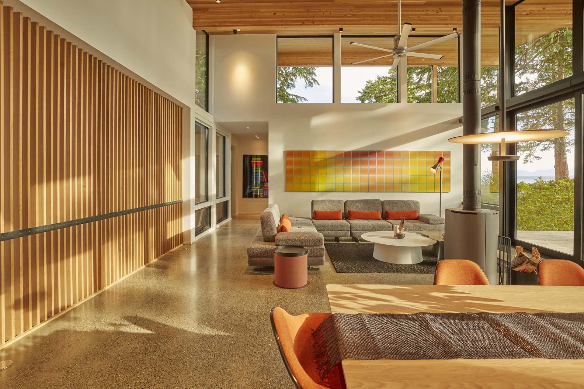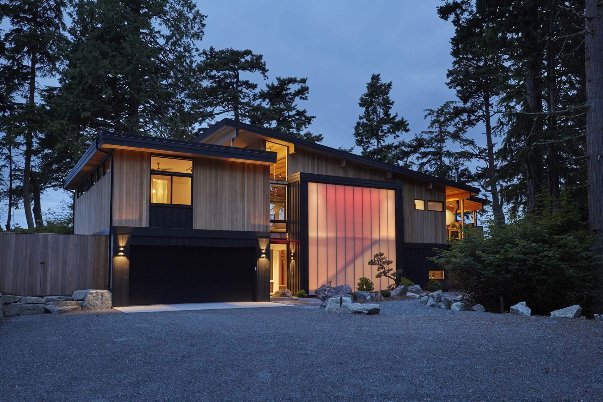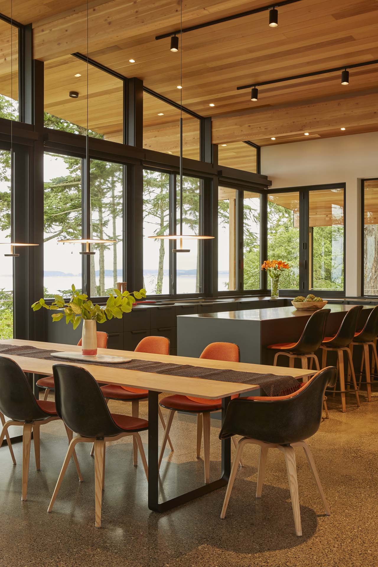 Custom architectural home design defines the Akris, designed by Aris Georges of OM Studio. The home sits on six acres on an island of the coast of Washington State. Panoramic vistas of the water and surrounding woods are visible through floor-to-ceiling windows in the great room and throughout the house.