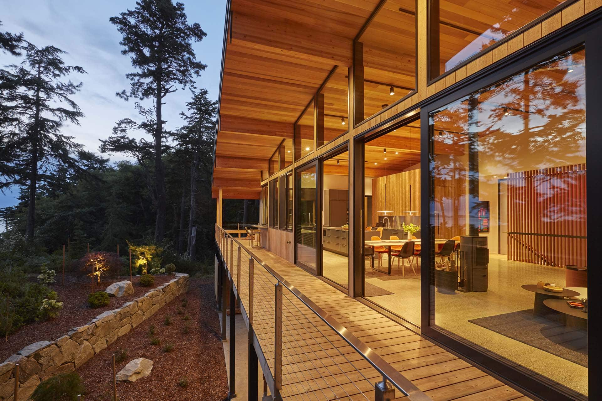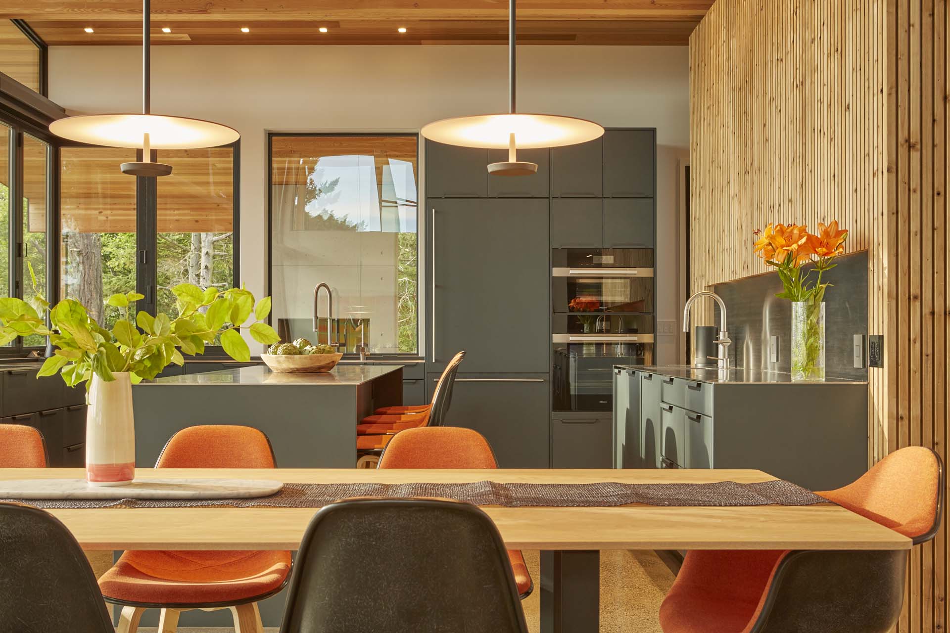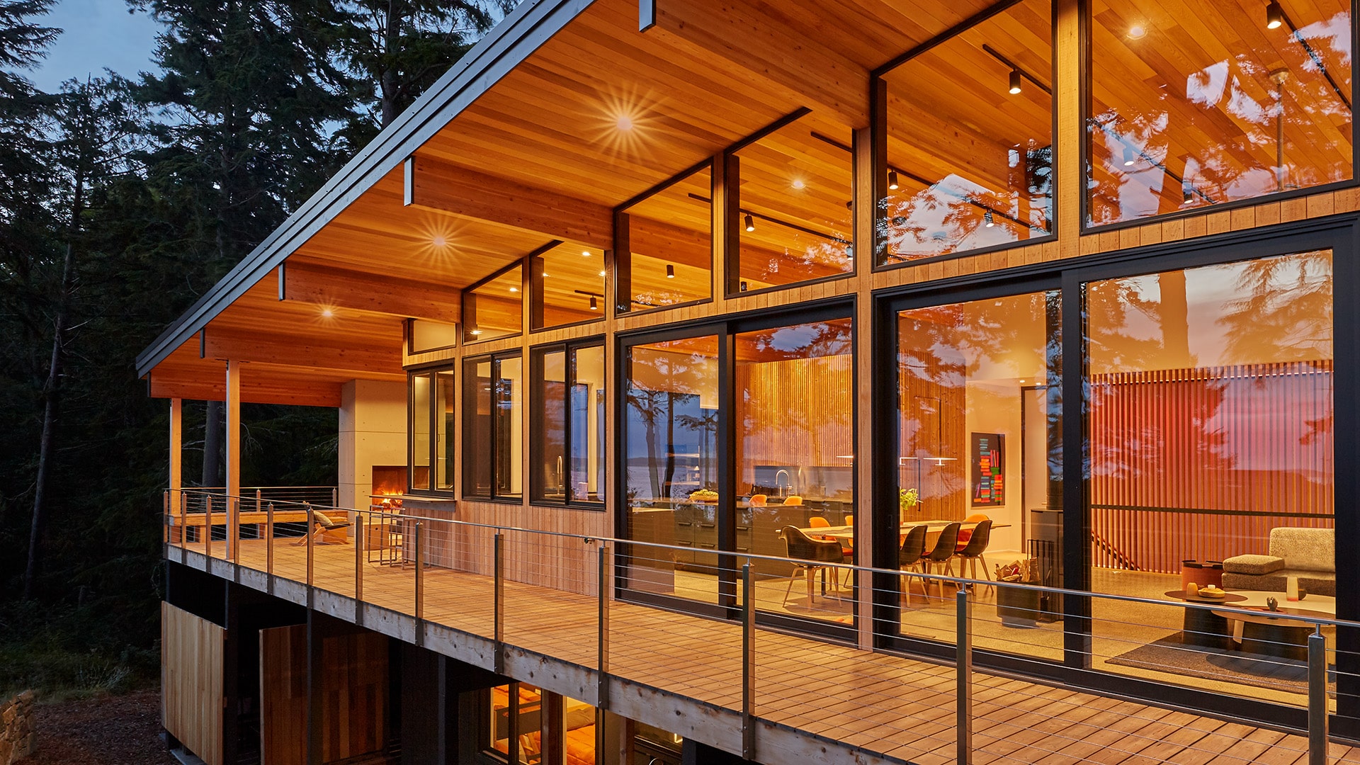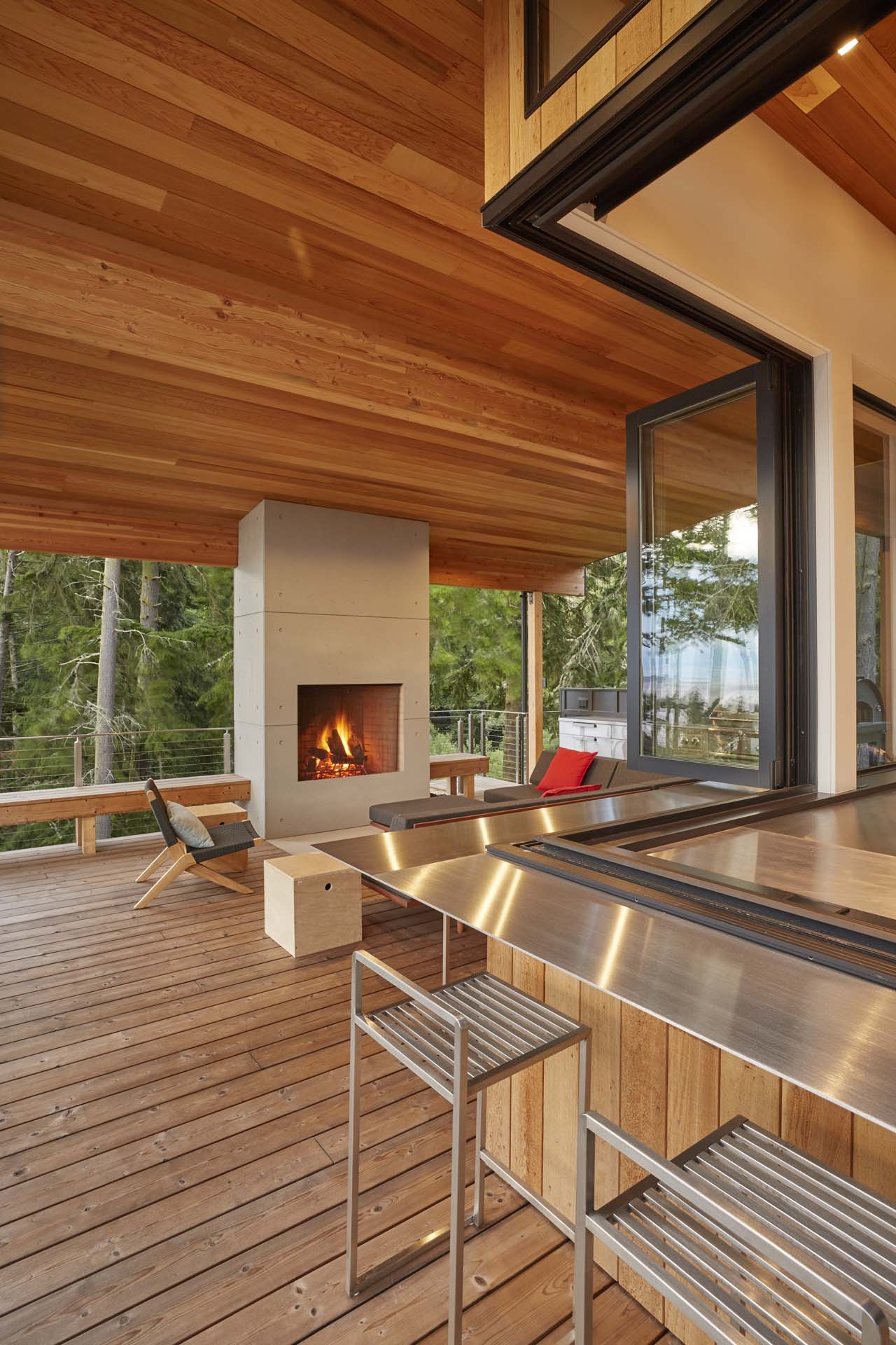 Custom architectural home design defines the Akris, designed by Aris Georges of OM Studio. The home sits on six acres on an island of the coast of Washington State. Panoramic vistas of the water and surrounding woods are visible through floor-to-ceiling windows in the great room and throughout the house.