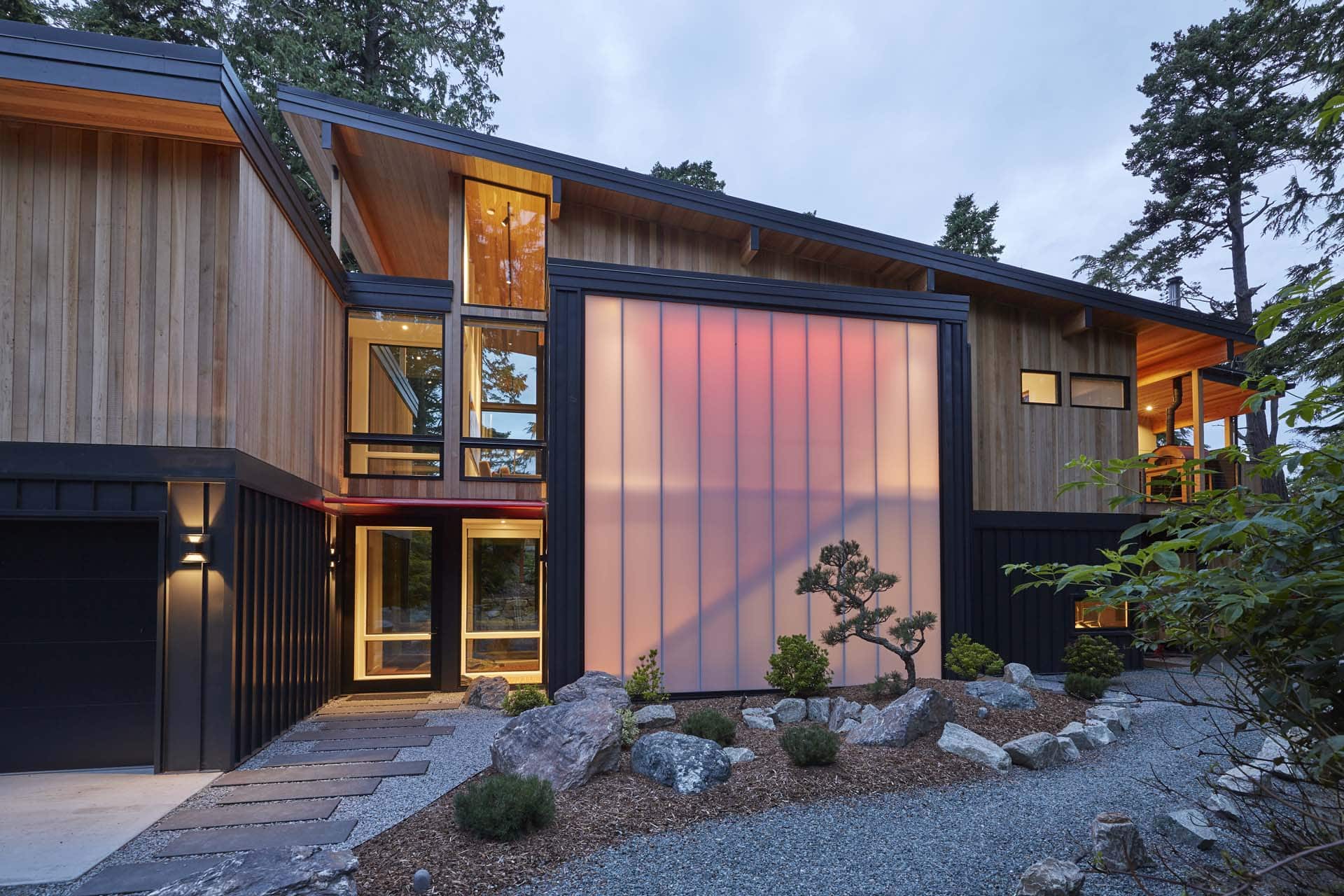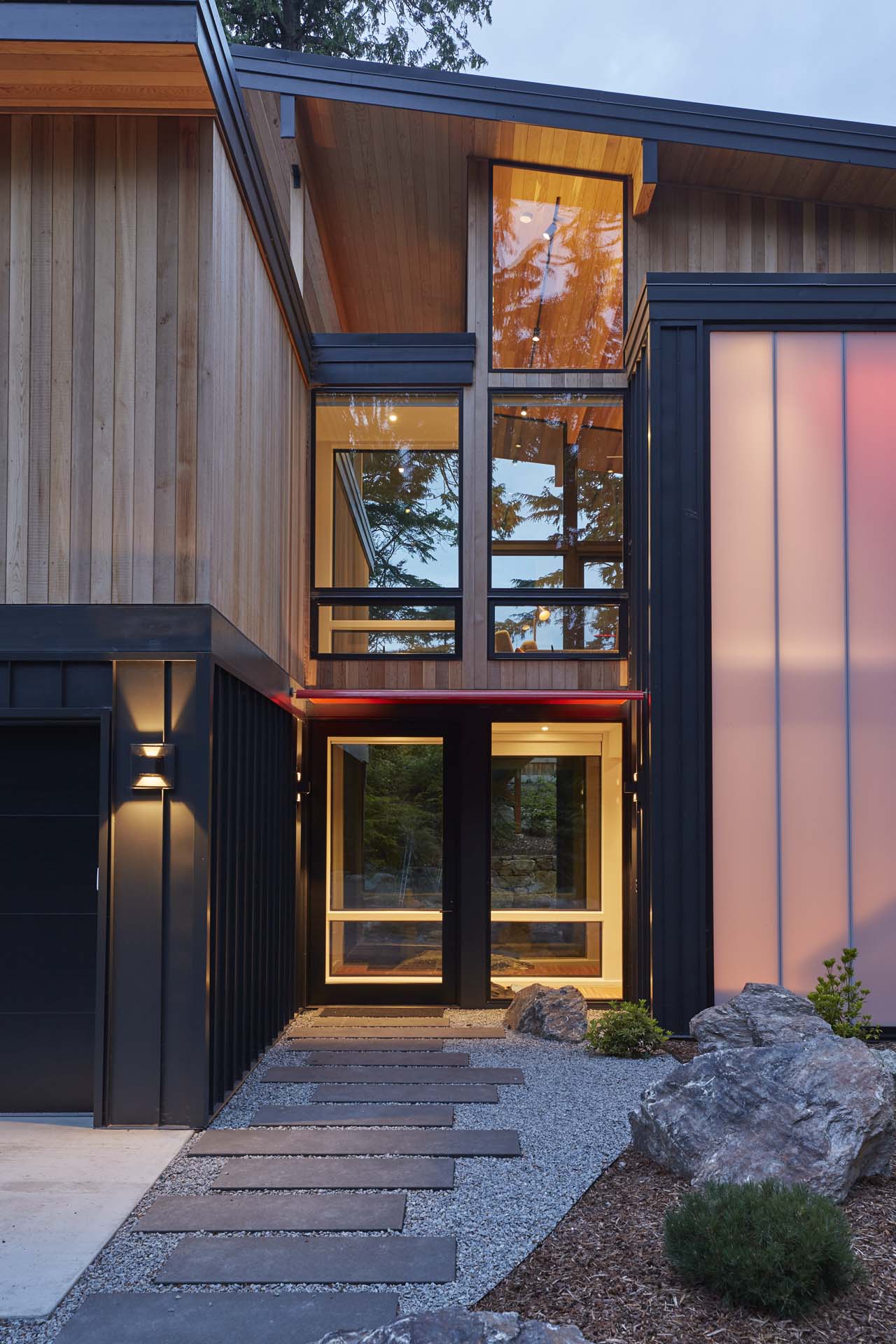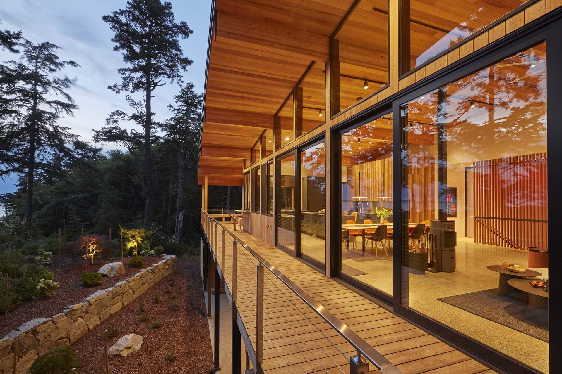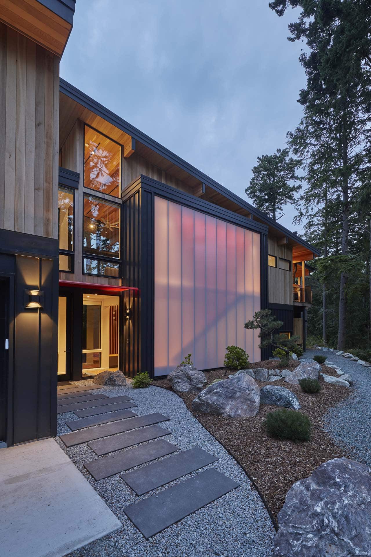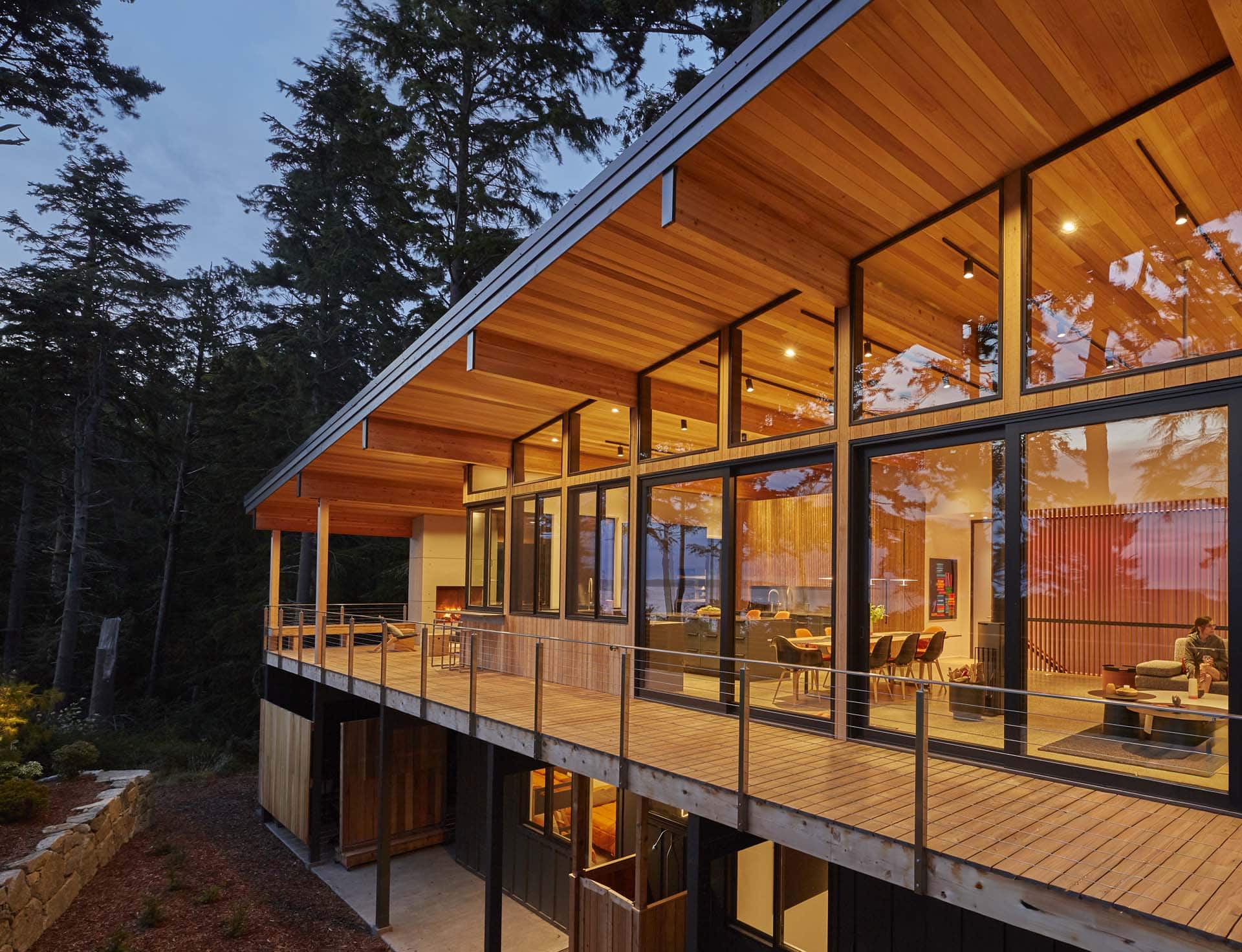 Custom architectural home design defines the Akris, designed by Aris Georges of OM Studio. The home sits on six acres on an island of the coast of Washington State. Panoramic vistas of the water and surrounding woods are visible through floor-to-ceiling windows in the great room and throughout the house.
