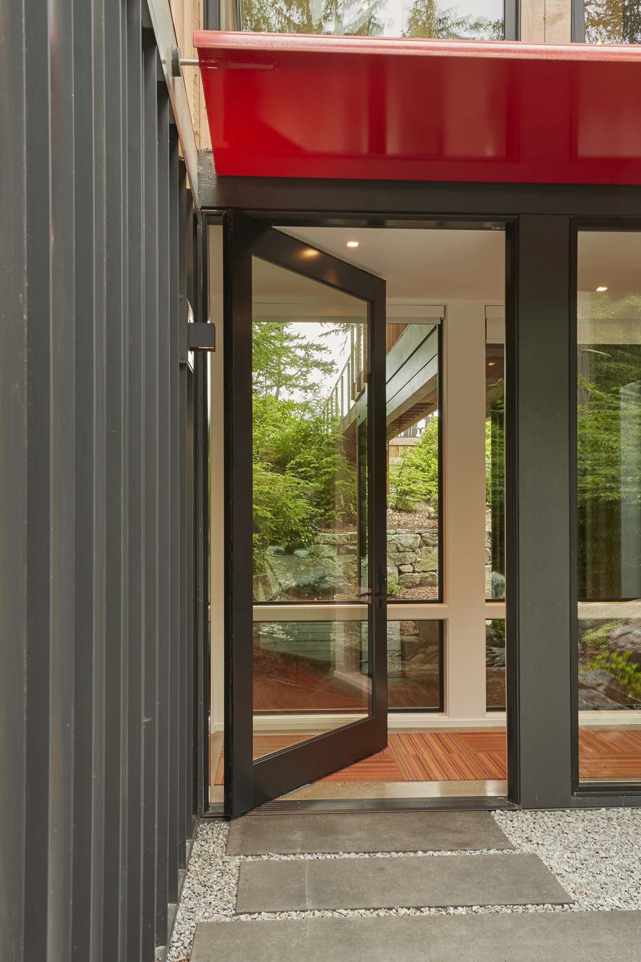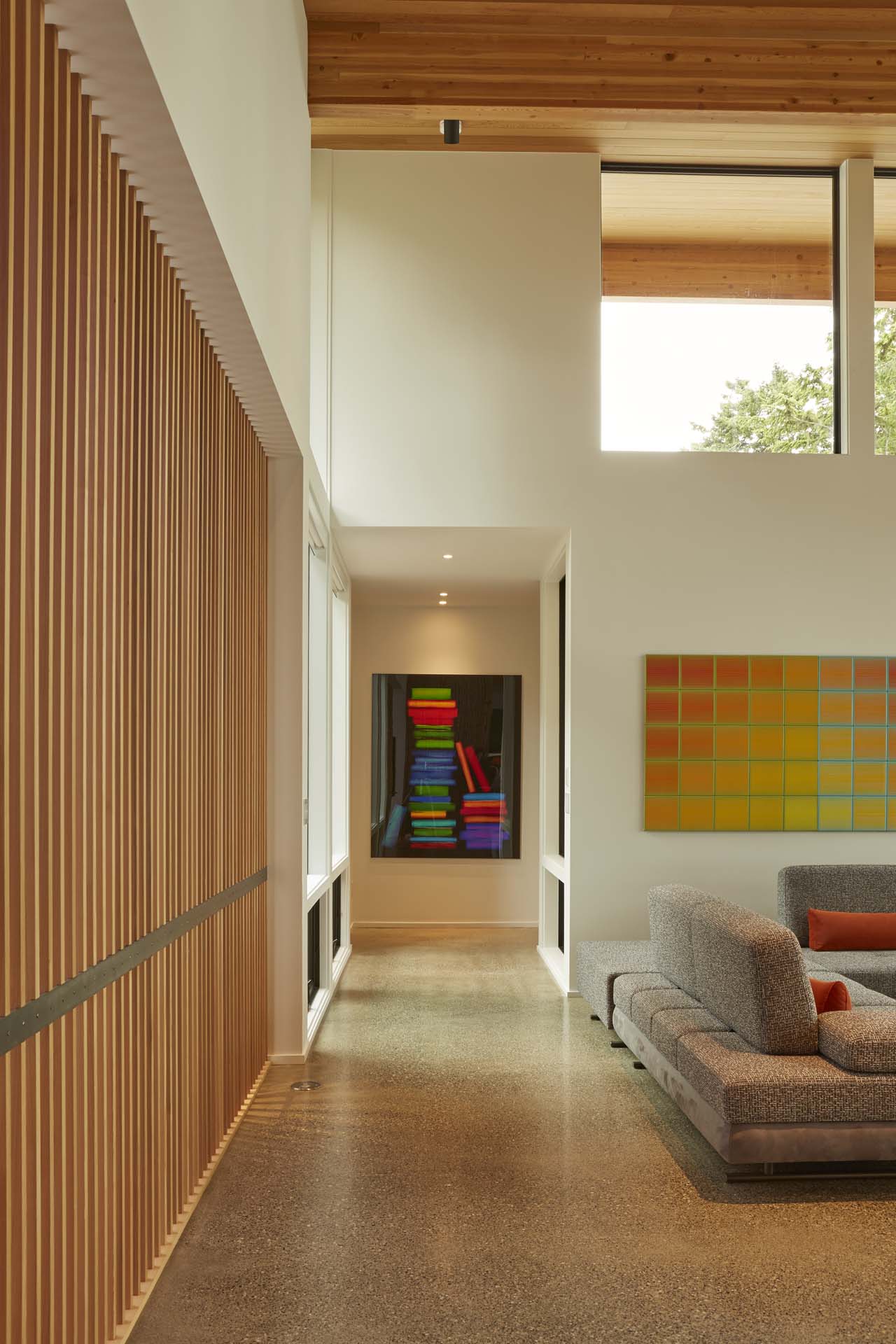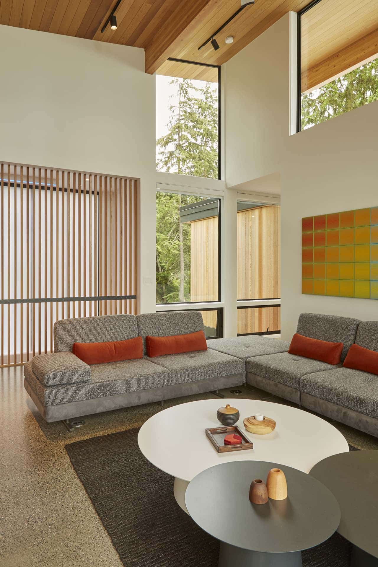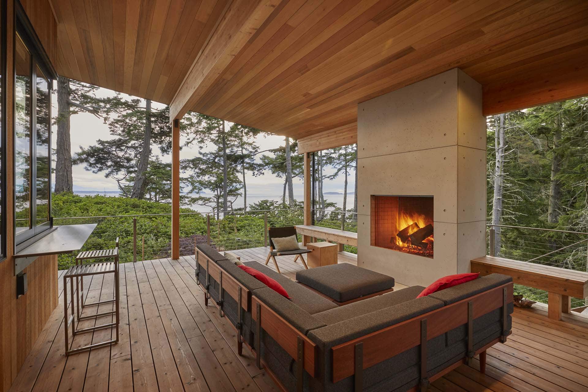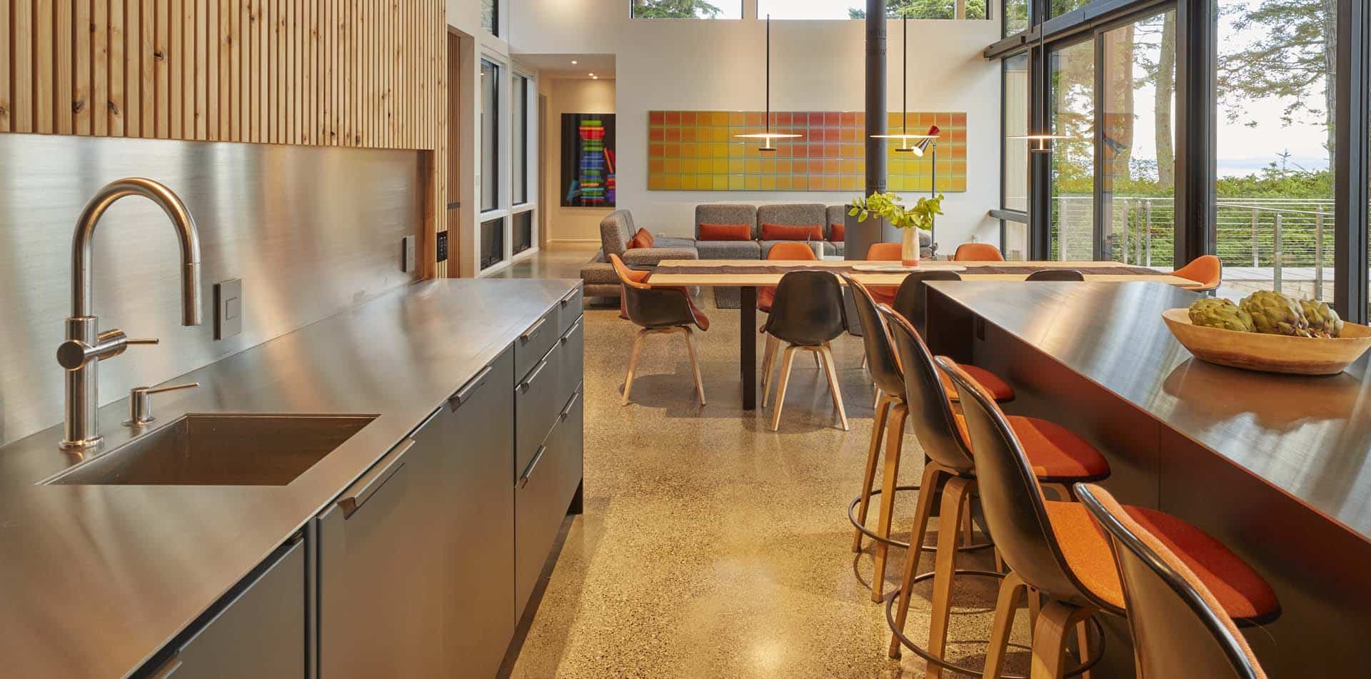 Custom architectural home design defines the Akris, designed by Aris Georges of OM Studio. The home sits on six acres on an island of the coast of Washington State. Panoramic vistas of the water and surrounding woods are visible through floor-to-ceiling windows in the great room and throughout the house.
