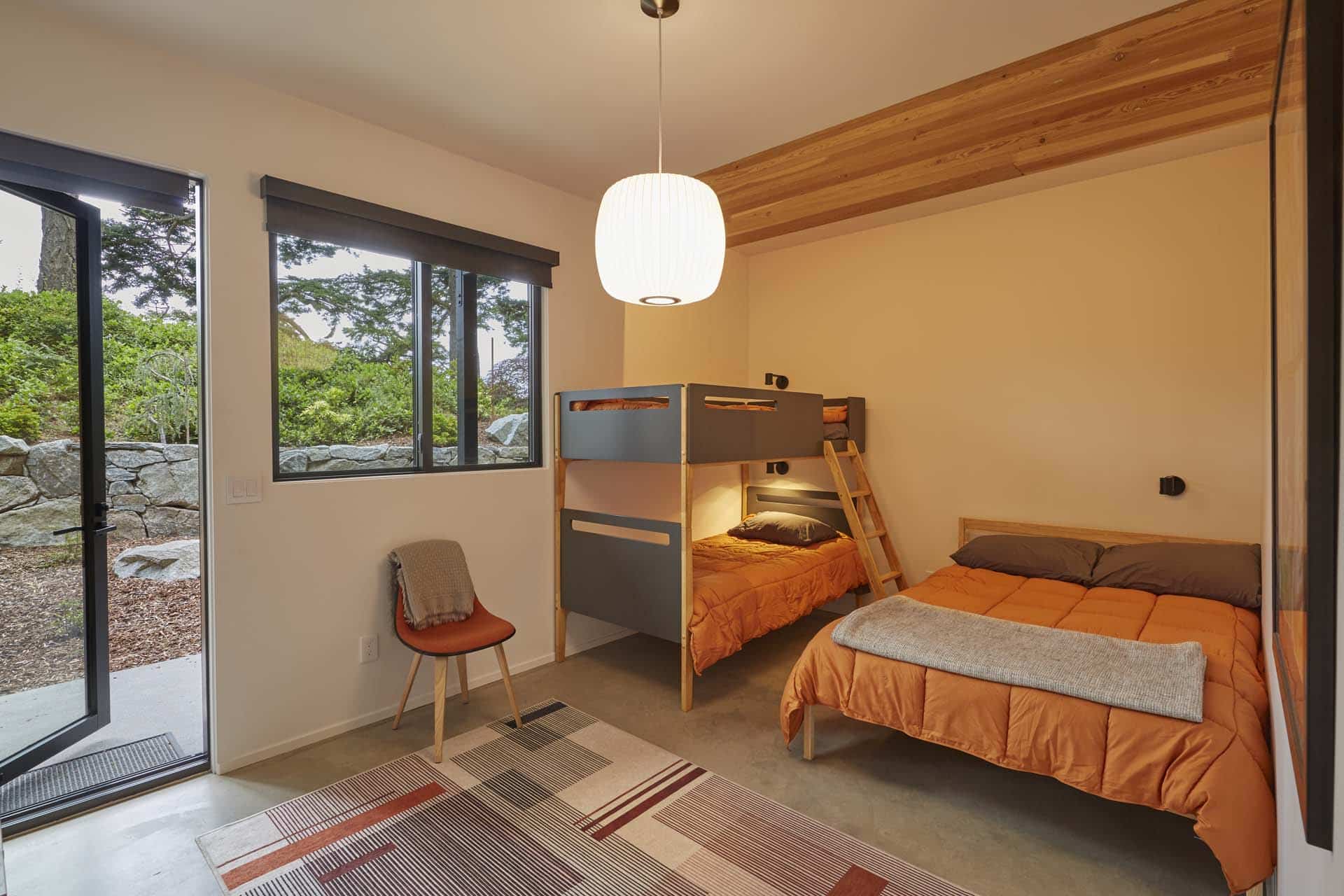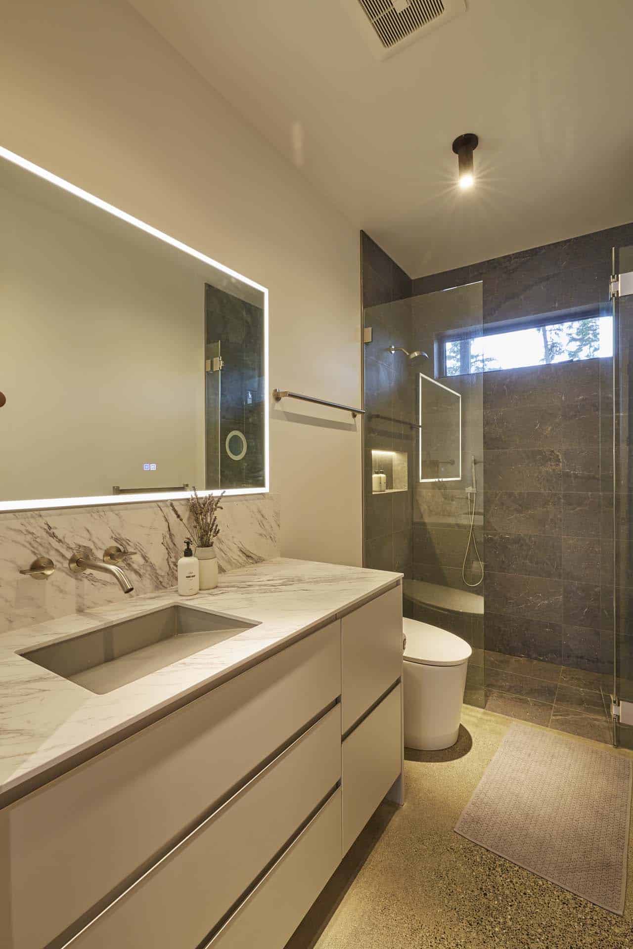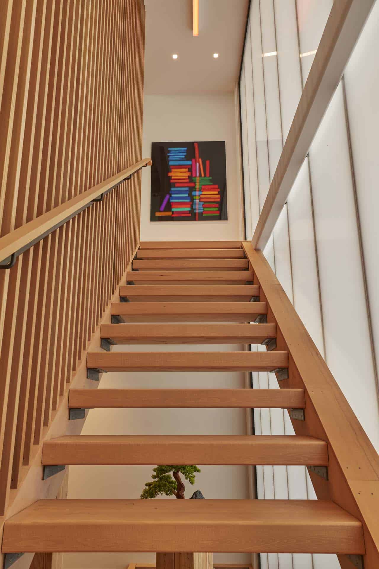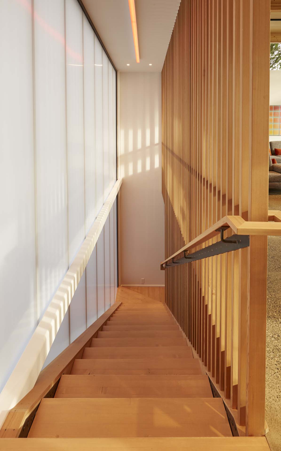 Akris is built on a slope, with entry on the lower level through a large pivot door. The lower level includes an office, bedroom, and media room. An open tread staircase leads up to the spectacular great room, with soaring cathedral ceilings, recessed lighting, and a wood burning stove. Two primary bedrooms, each with a three-quarter bath, are located on the upper level. The kitchen features cabinetry by Reform, stainless steel countertops, and a corner window that opens to the outside deck.
