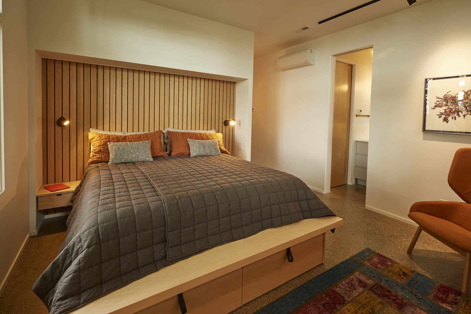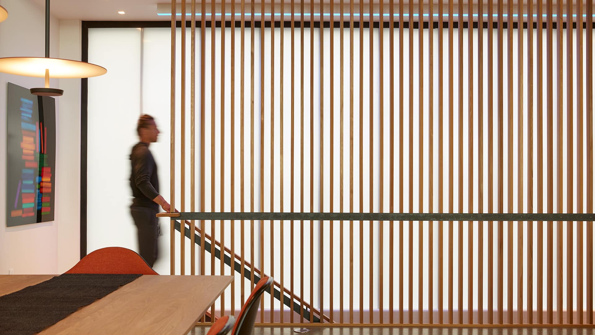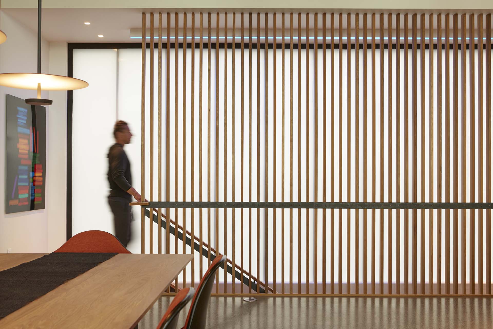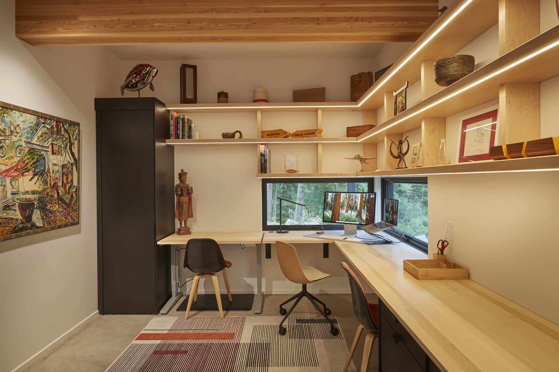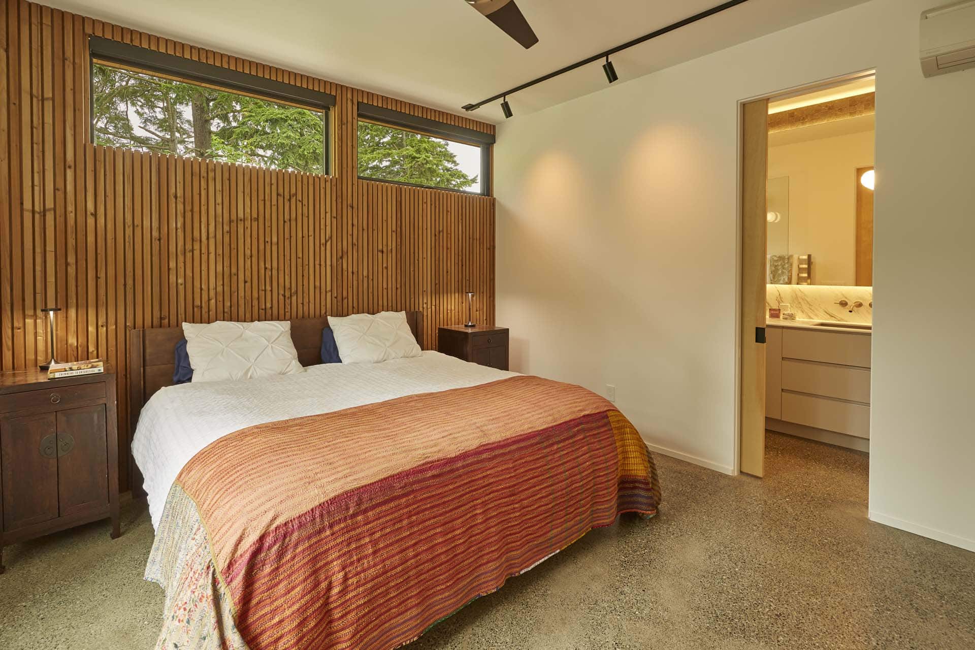 Akris is built on a slope, with entry on the lower level through a large pivot door. The lower level includes an office, bedroom, and media room. An open tread staircase leads up to the spectacular great room, with soaring cathedral ceilings, recessed lighting, and a wood burning stove. Two primary bedrooms, each with a three-quarter bath, are located on the upper level. The kitchen features cabinetry by Reform, stainless steel countertops, and a corner window that opens to the outside deck.