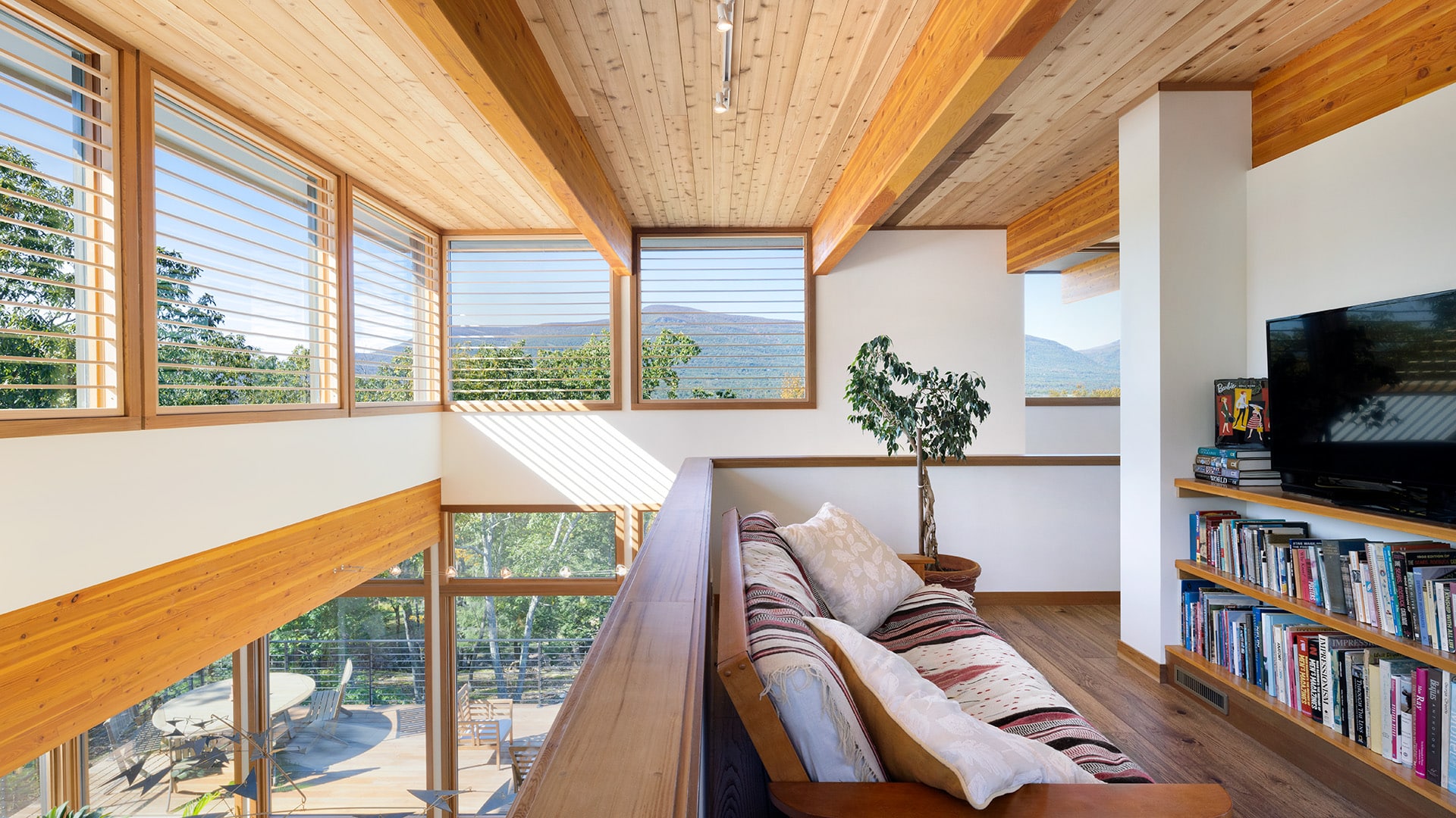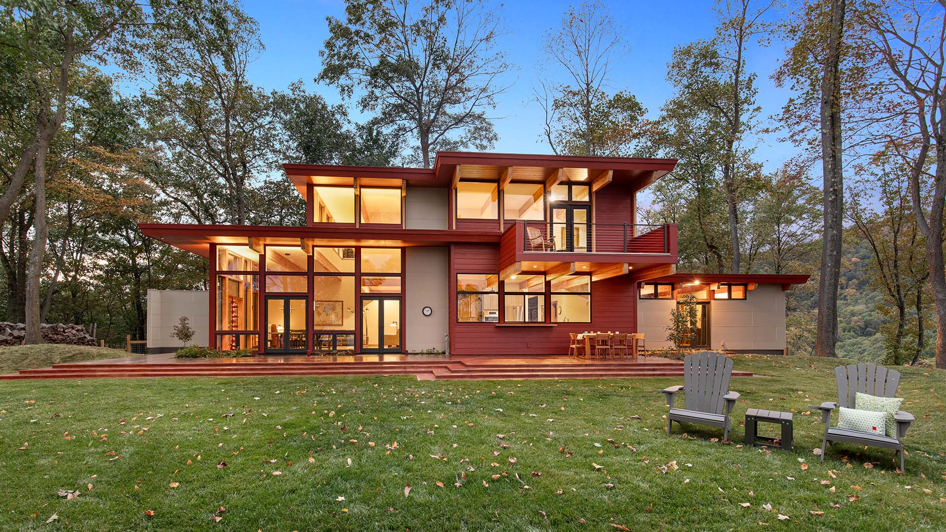 In modernizing this design, we moved the primary bedroom suite to the main floor and also tucked it into a private wing with access to the outdoors. Deep overhangs shade the house from the summer sun and add to the horizontality of the design. The varied roof elevations and balcony create a harmonious exterior. Plenty of natural light enters from a wall of windows in the great room.