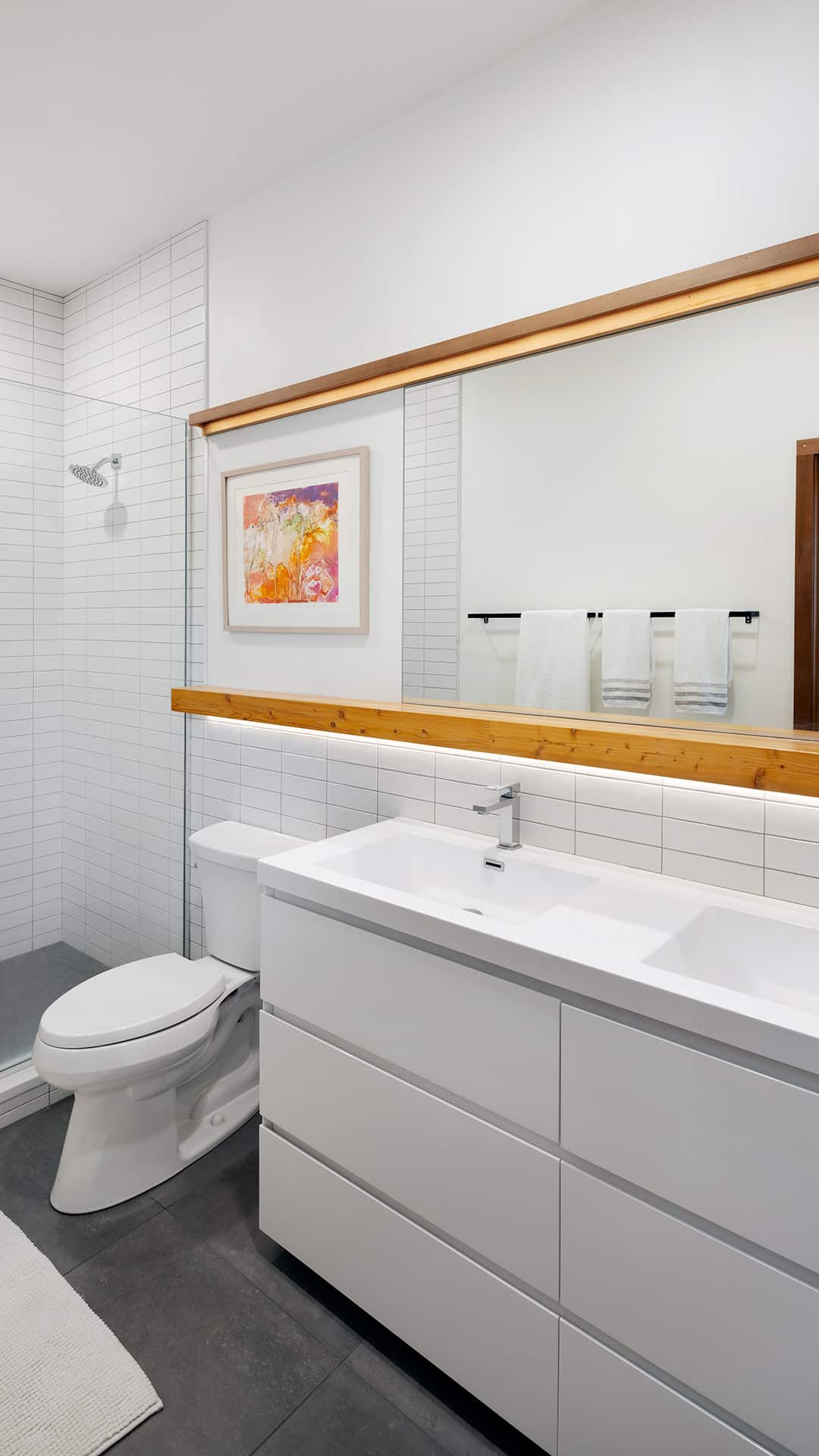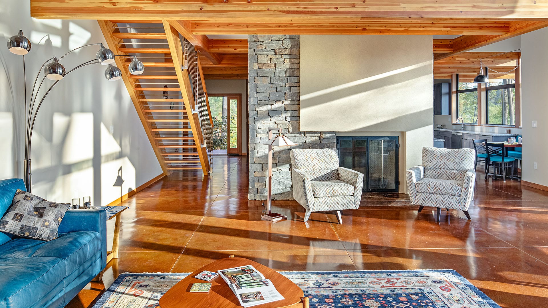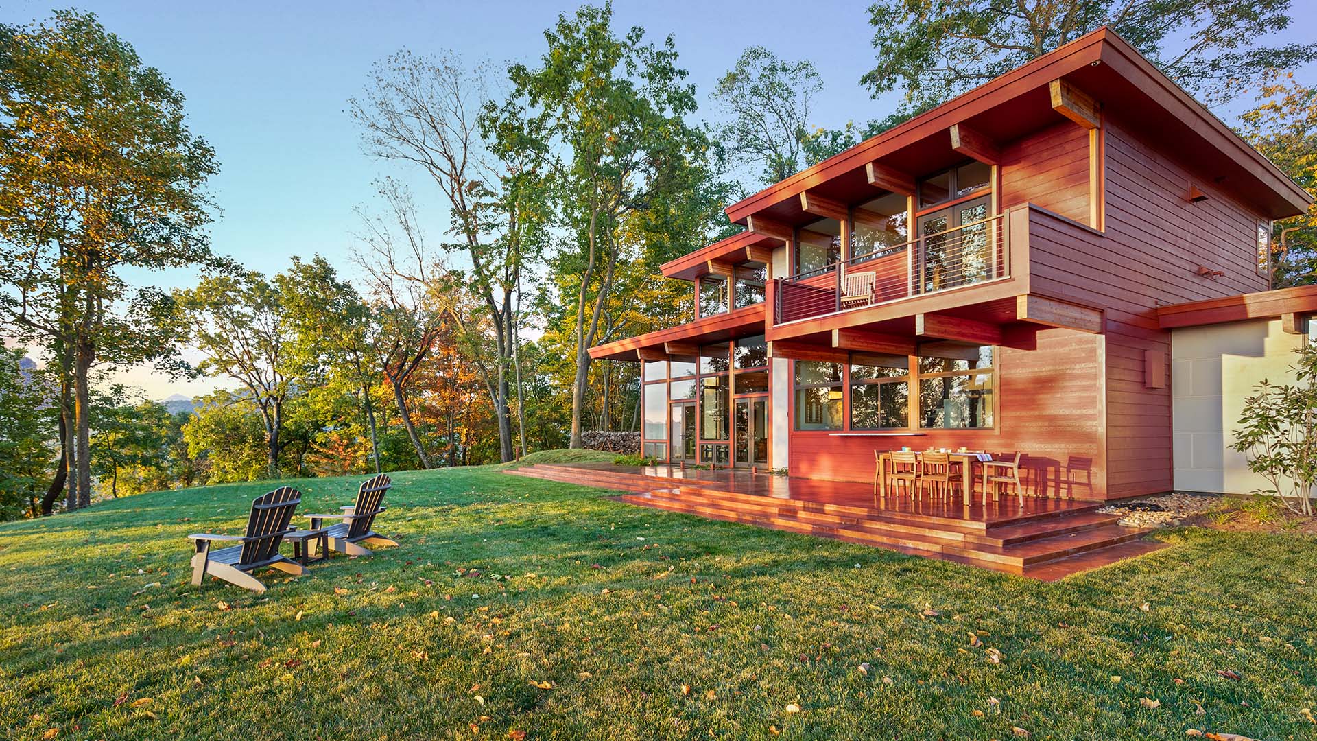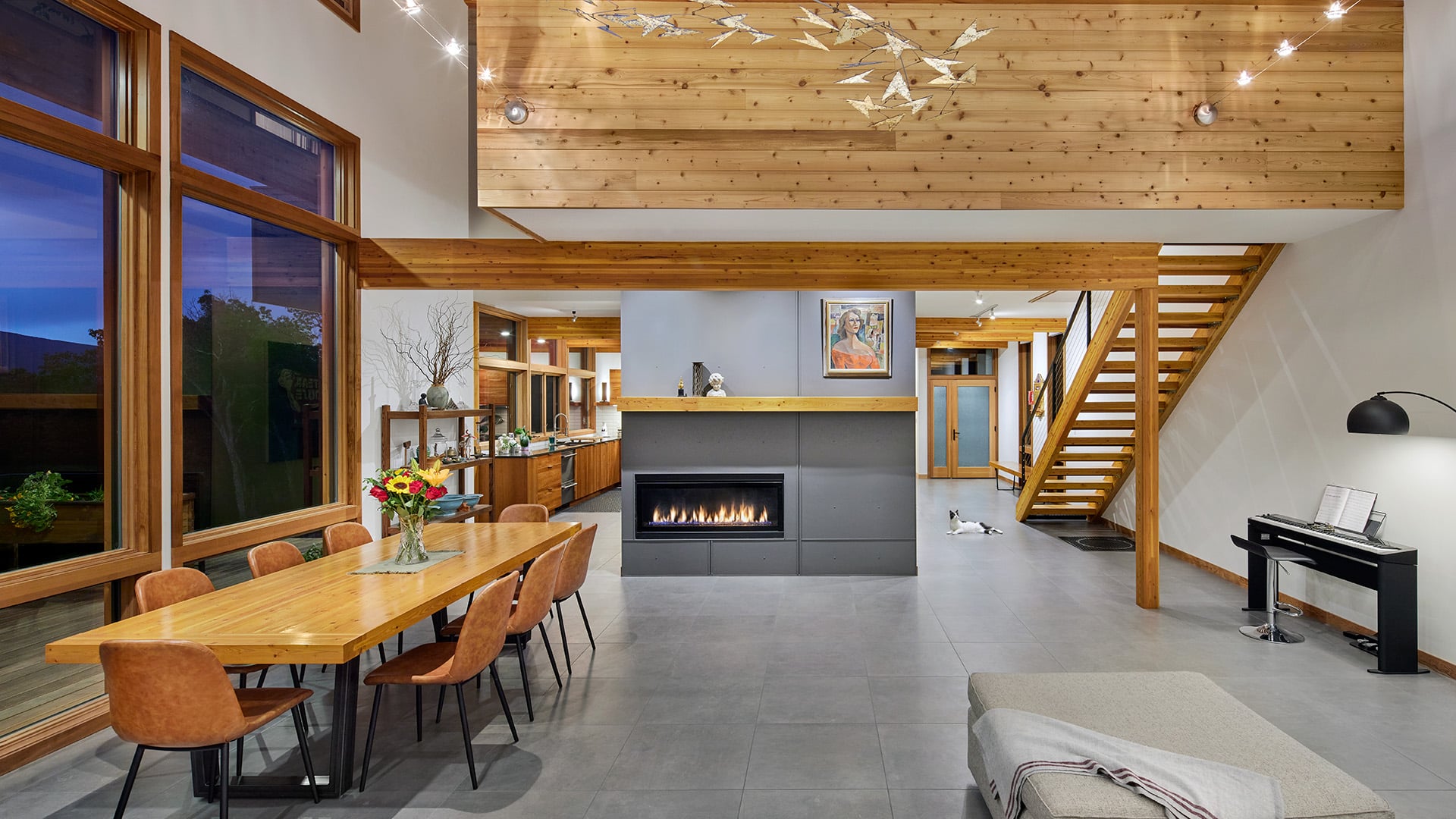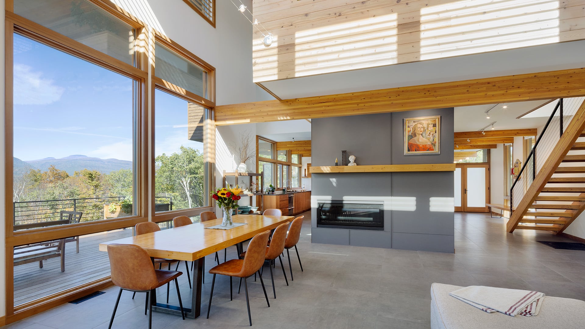 Inspired by Frank Lloyd Wright’s Bachman-Wilson home design (and featured in the Wall Street Journal), Lindal’s Crystal Springs Usonian home style stacks two bedrooms above the kitchen/dining/utility core, giving the living room a generous double-height ceiling with a wall of glass on the view side that makes the home seem larger. The utility core allows for a varied circulation pattern and direct access to the kitchen from the entry. The upper mezzanine wraps around the hearth, overlooking the living room, and can be used as a study.